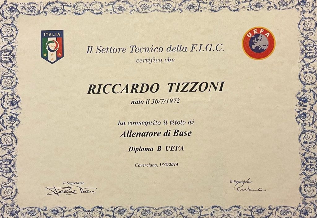 Riccardo Tizzoni è allenatore UEFA B con esperienza ultra decennale nelle scuole calcio settore giovanile e prime squadre fino alla Serie D, certificato e specializzato in lezioni di tecnica calcistica individuale, autorizzato all’utilizzo della metodologia 1VS1.